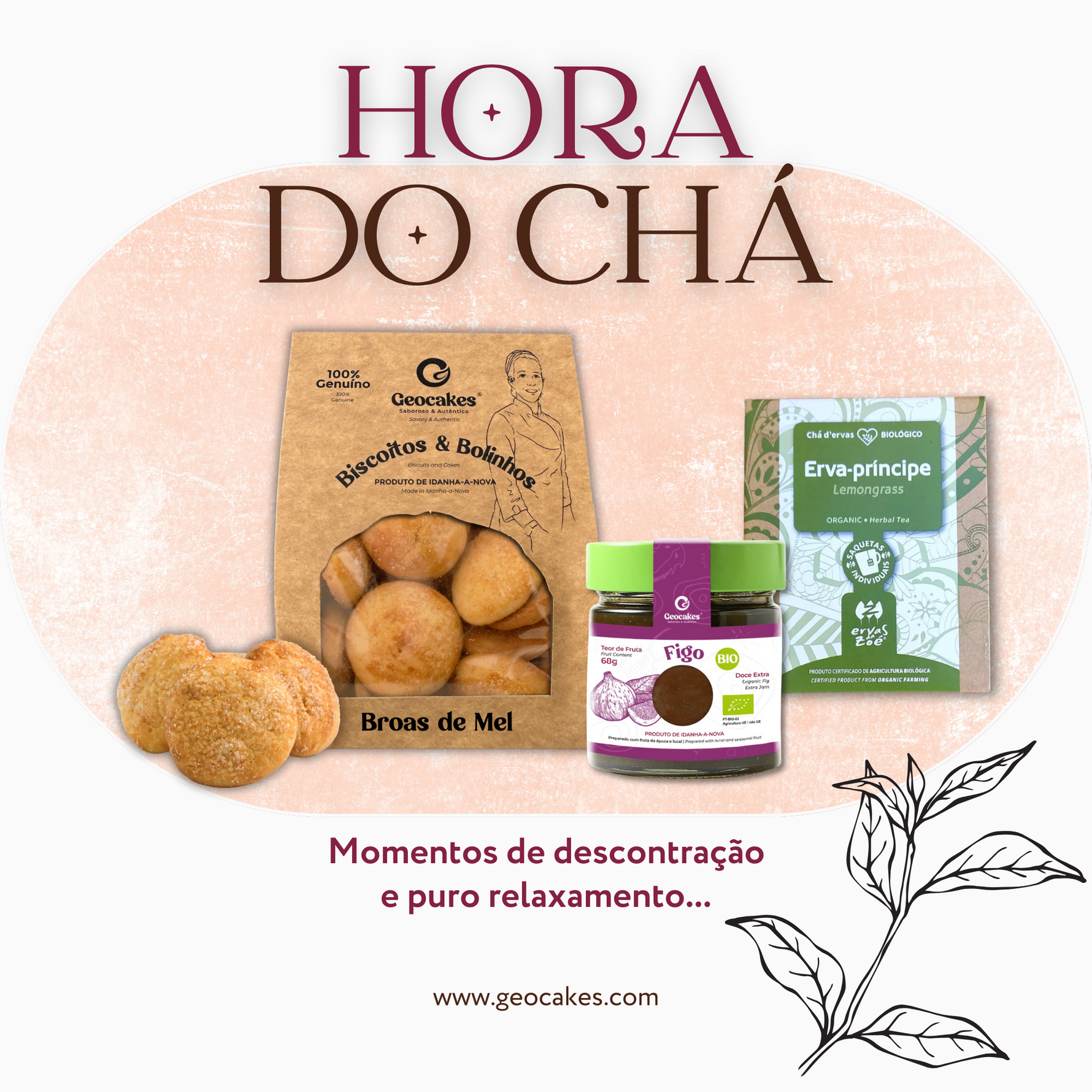Este conjunto harmonioso reúne as nossas deliciosas Broas de Mel, com a sua textura macia e o sabor doce e reconfortante do mel português, o nosso requintado Doce de Figo Biológico, uma iguaria tradicional que celebra a doçura natural desta fruta mediterrânica, e a aromática Infusão de Erva Príncipe, uma bebida relaxante que perfuma e acalma os sentidos.